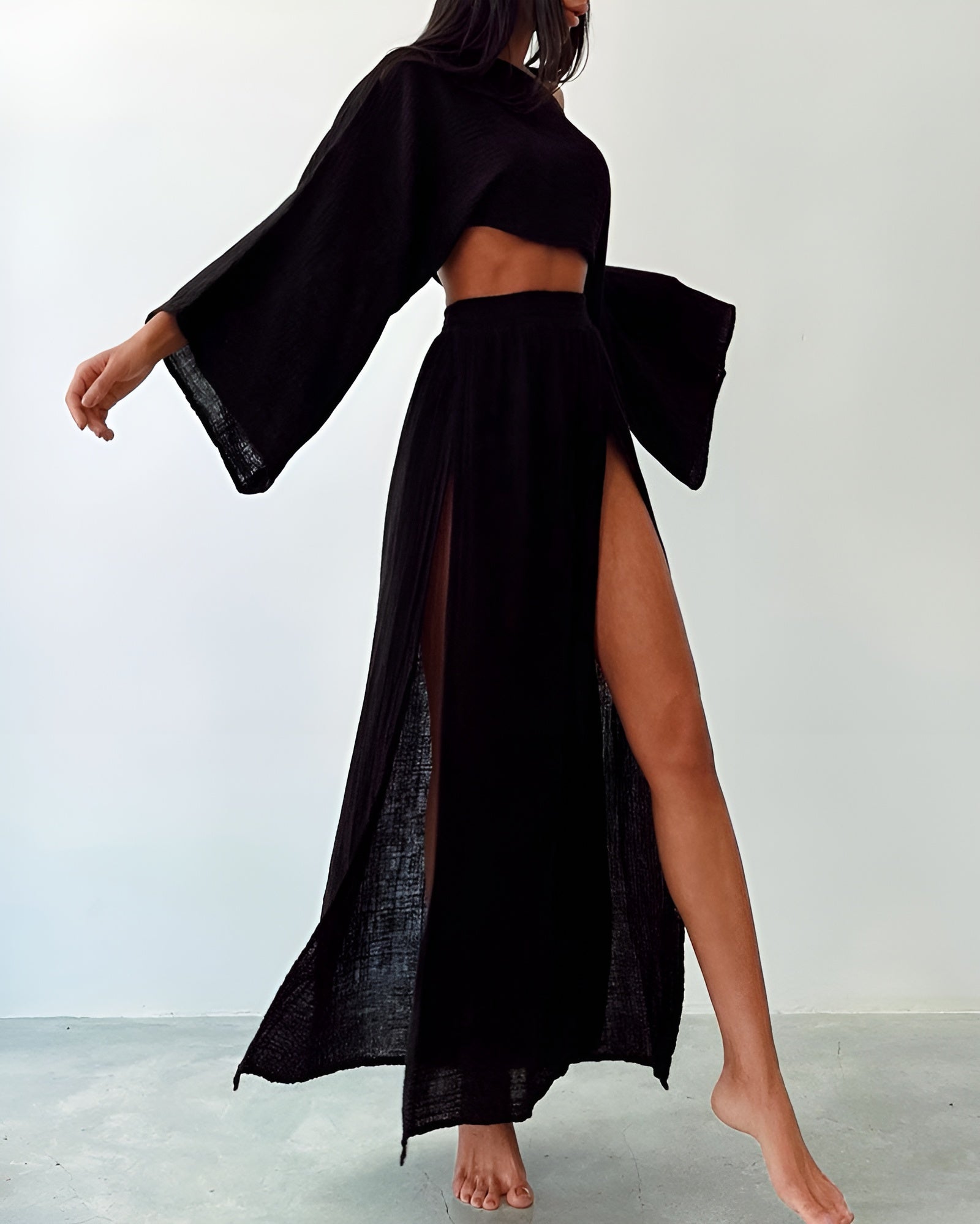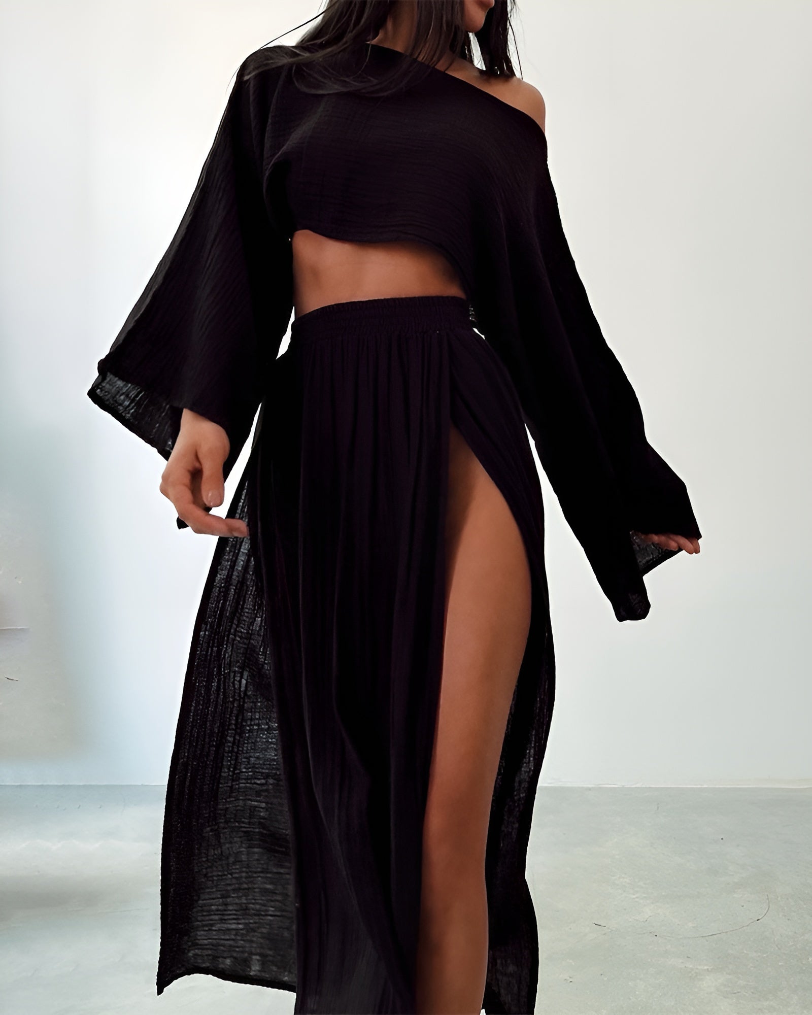 Upptäck sommarelegansen med vårt tvådelade linne set för damer, bestående av en vacker kjol med slits och en matchande topp. Setet erbjuder luftighet, stil och komfort. Slitsen tillför allure, medan den lösa toppen med vida ärmar ger en chic och avslappnad look. Kjolen med hög midja framhäver din siluett på ett elegant sätt.